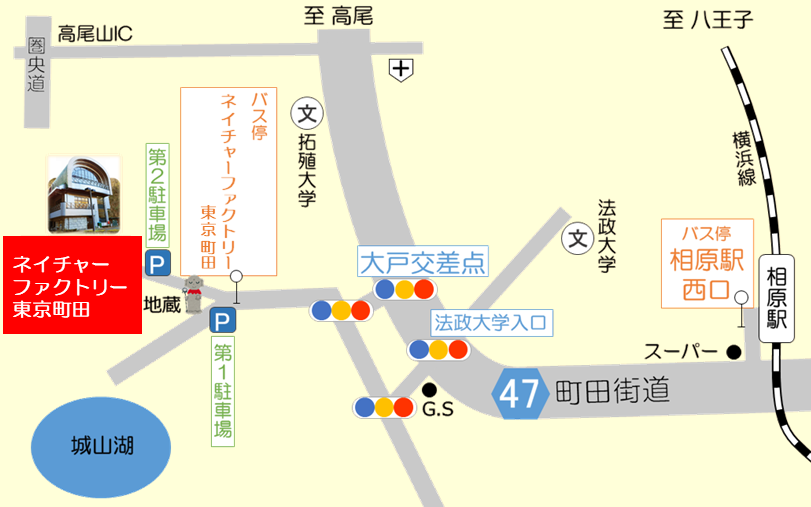3.約400m進むと、左側に「ネイチャーファクトリー東京町田」バス停第1駐車場
